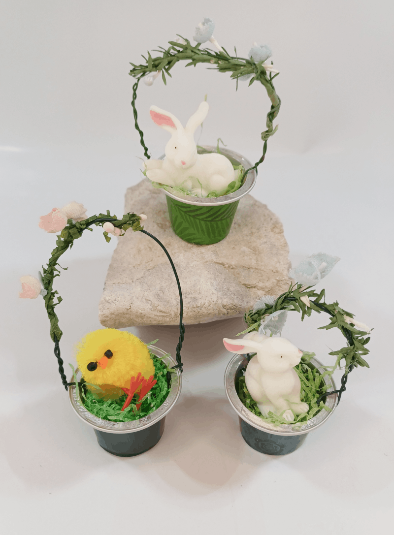Zauberhafte Körbchen aus Kaffeekapseln! Mit süßen Kücken oder putzigen Hasen sind sie die perfekte Deko für den Osterstrauch oder ein liebevolles Mitbringsel. Hol dir dein Körbchen und lass die Osterzeit beginnen!