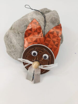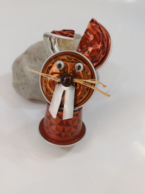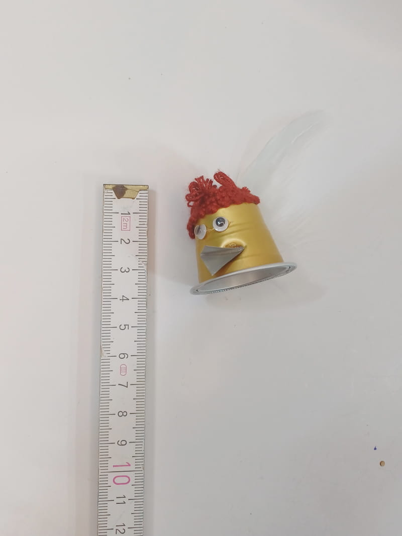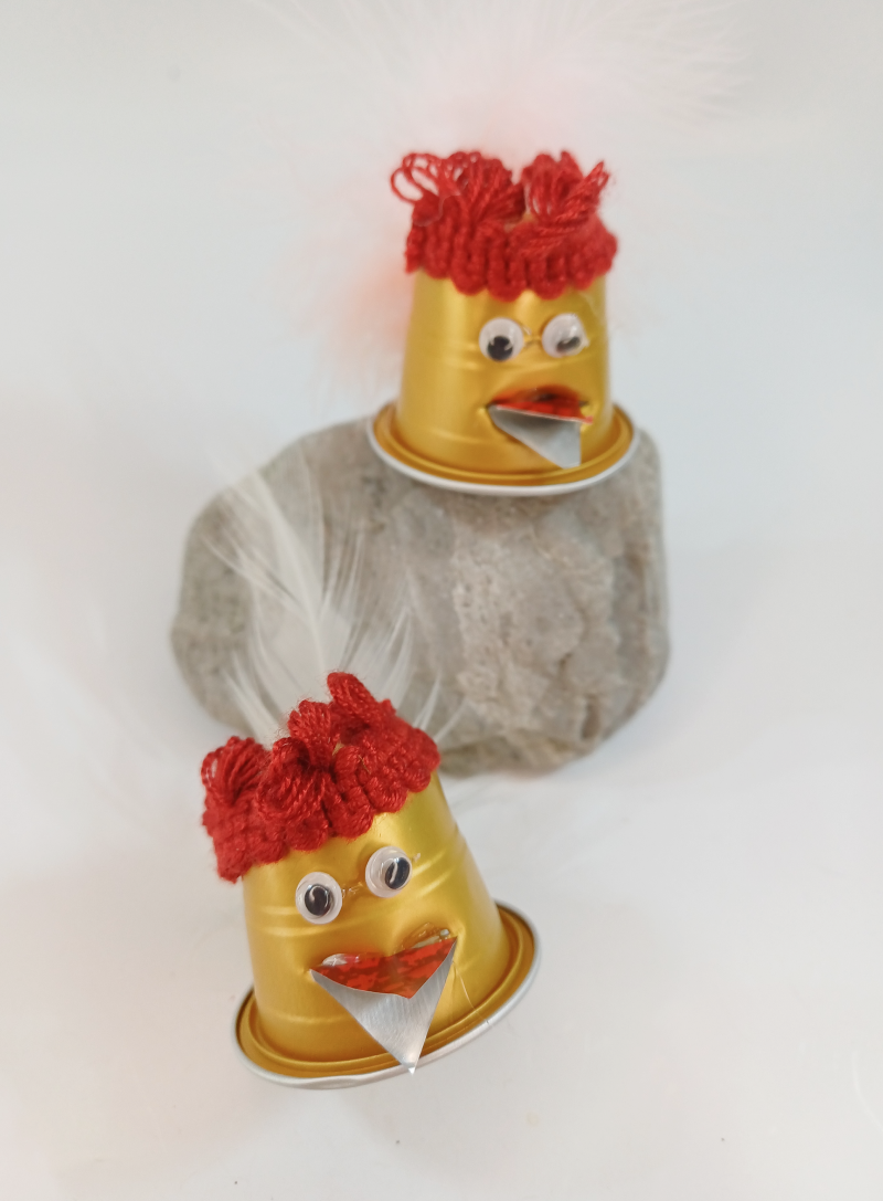 Orgineller Hahn aus Kaffeekapsel gefertigt, mit Feder und Wackelaugen.