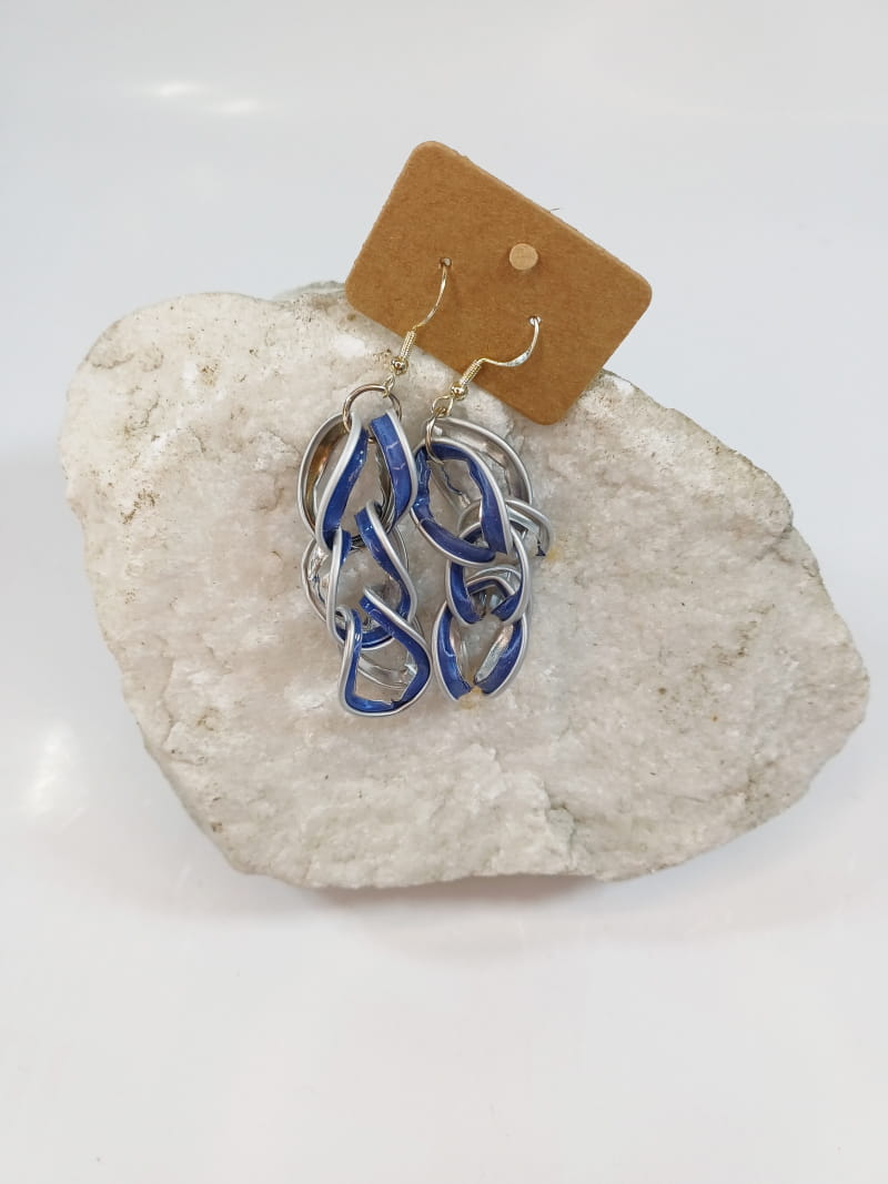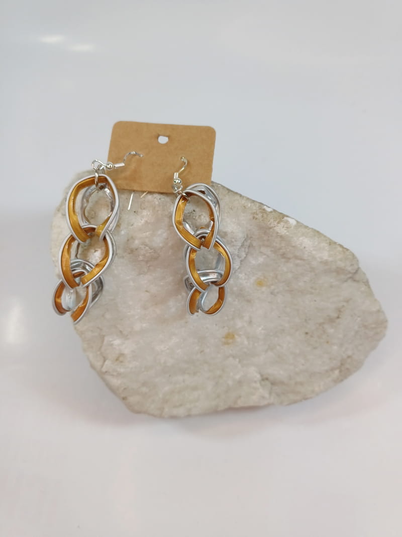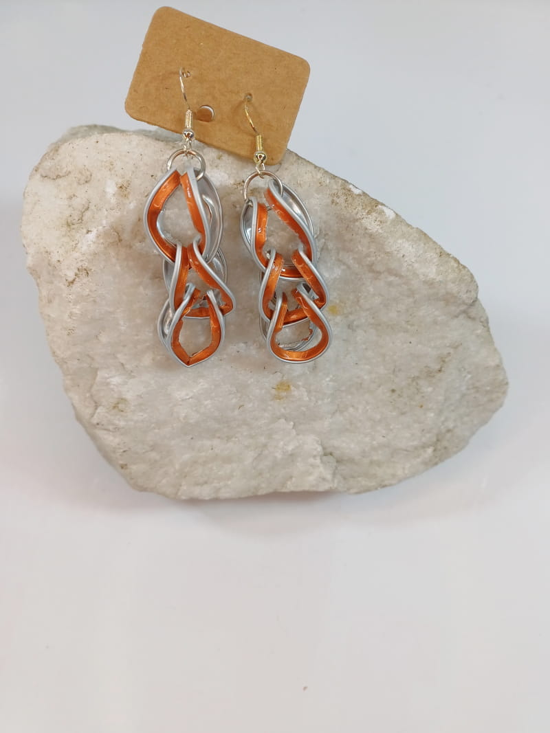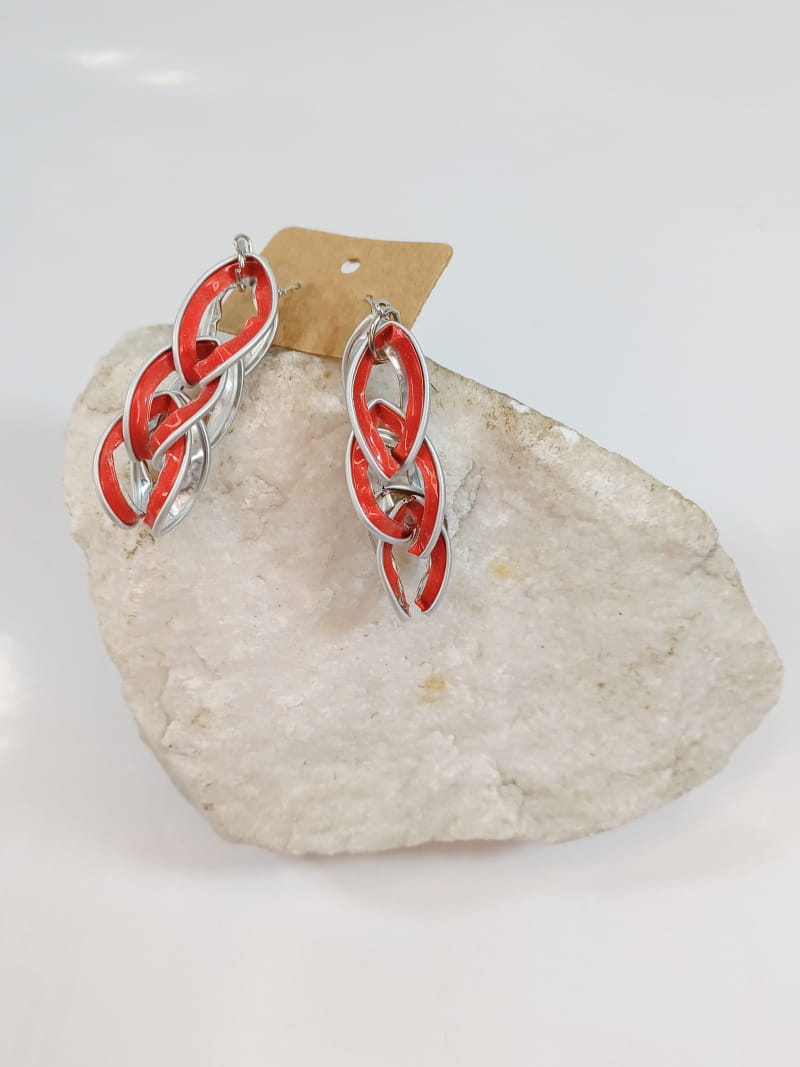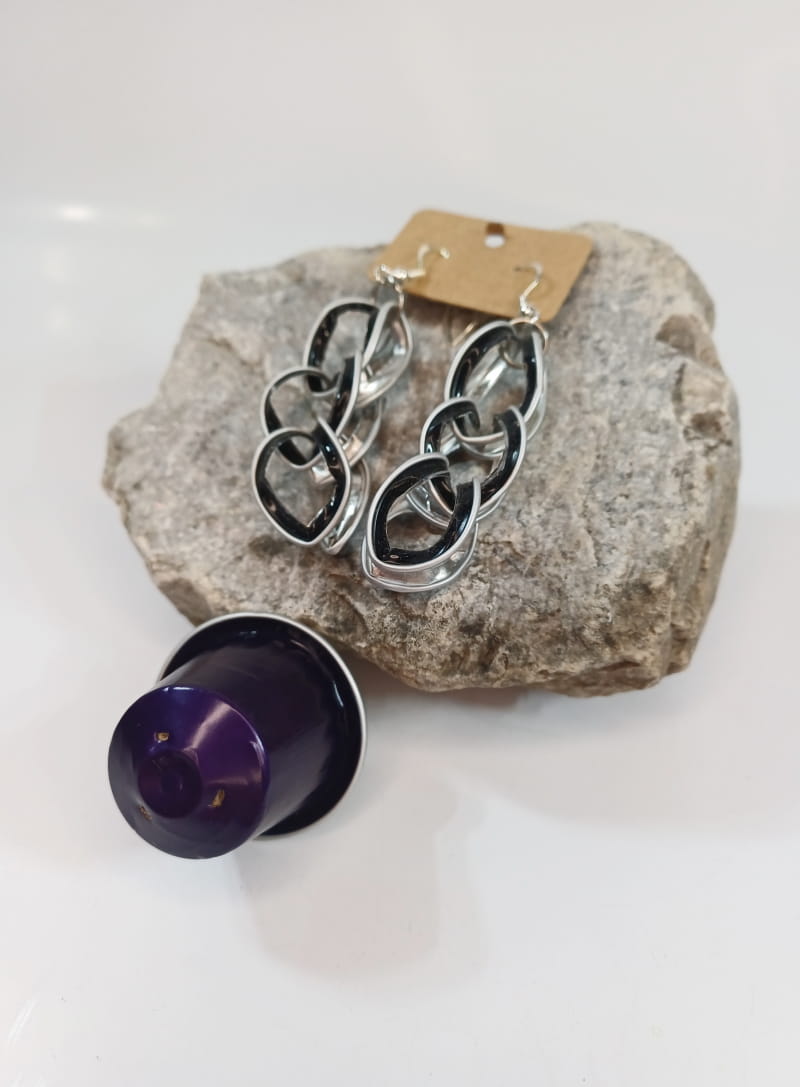 Diese handgefertigten Ohrringe vereinen Nachhaltigkeit und Stil. Aus wiederverwendeten Kaffeekapseln gefertigt, entstehen einzigartige, farbenfrohe Schmuckstücke, die durch ineinander verschlungene Kettenglieder zu einem echten Blickfang werden.